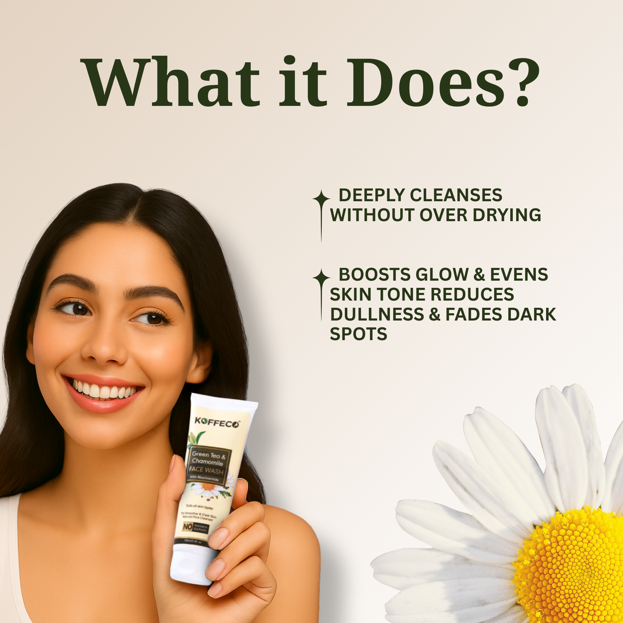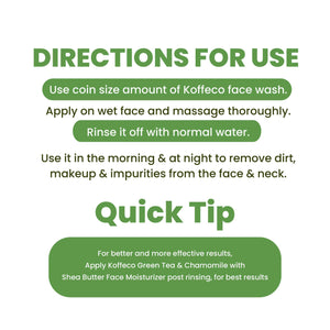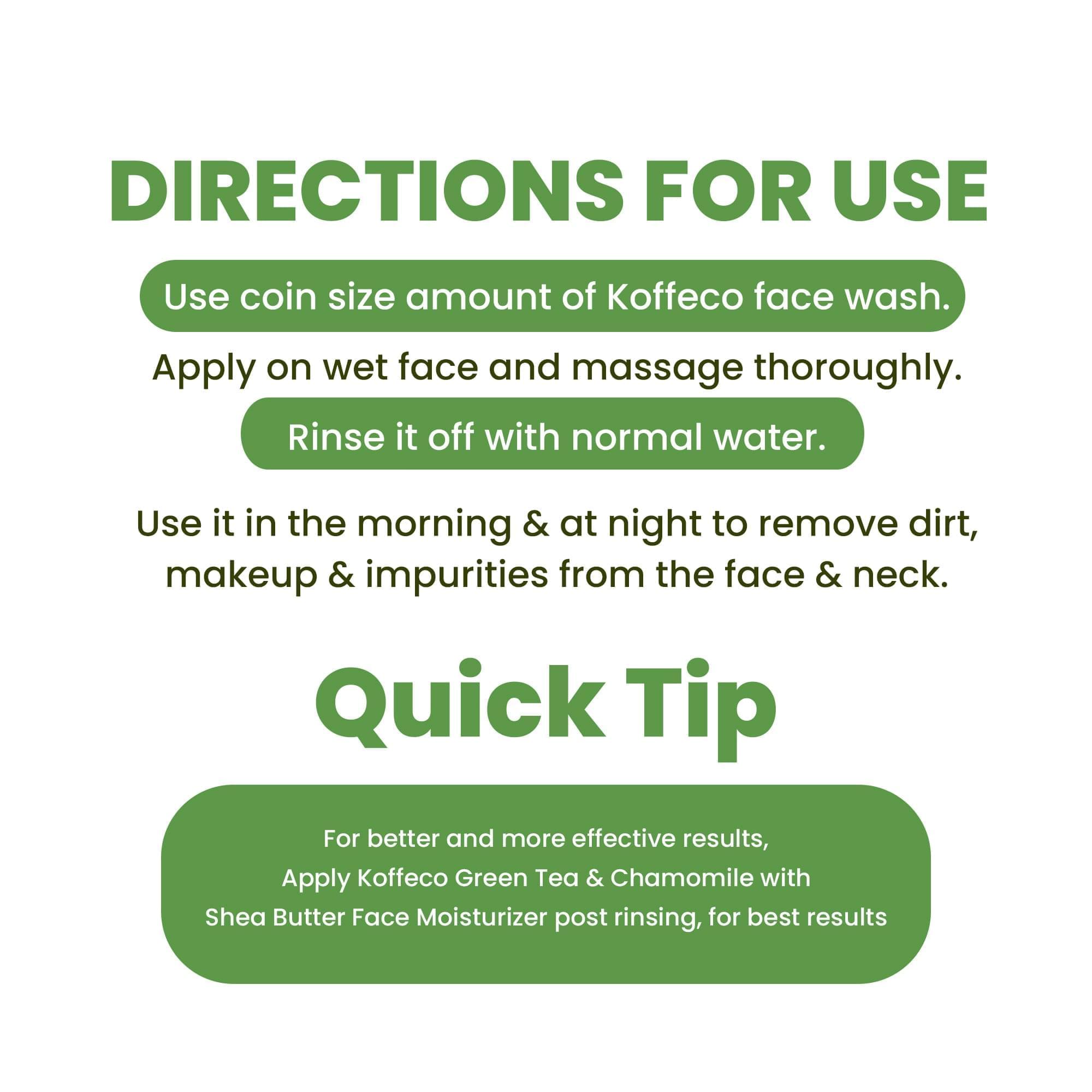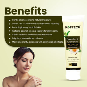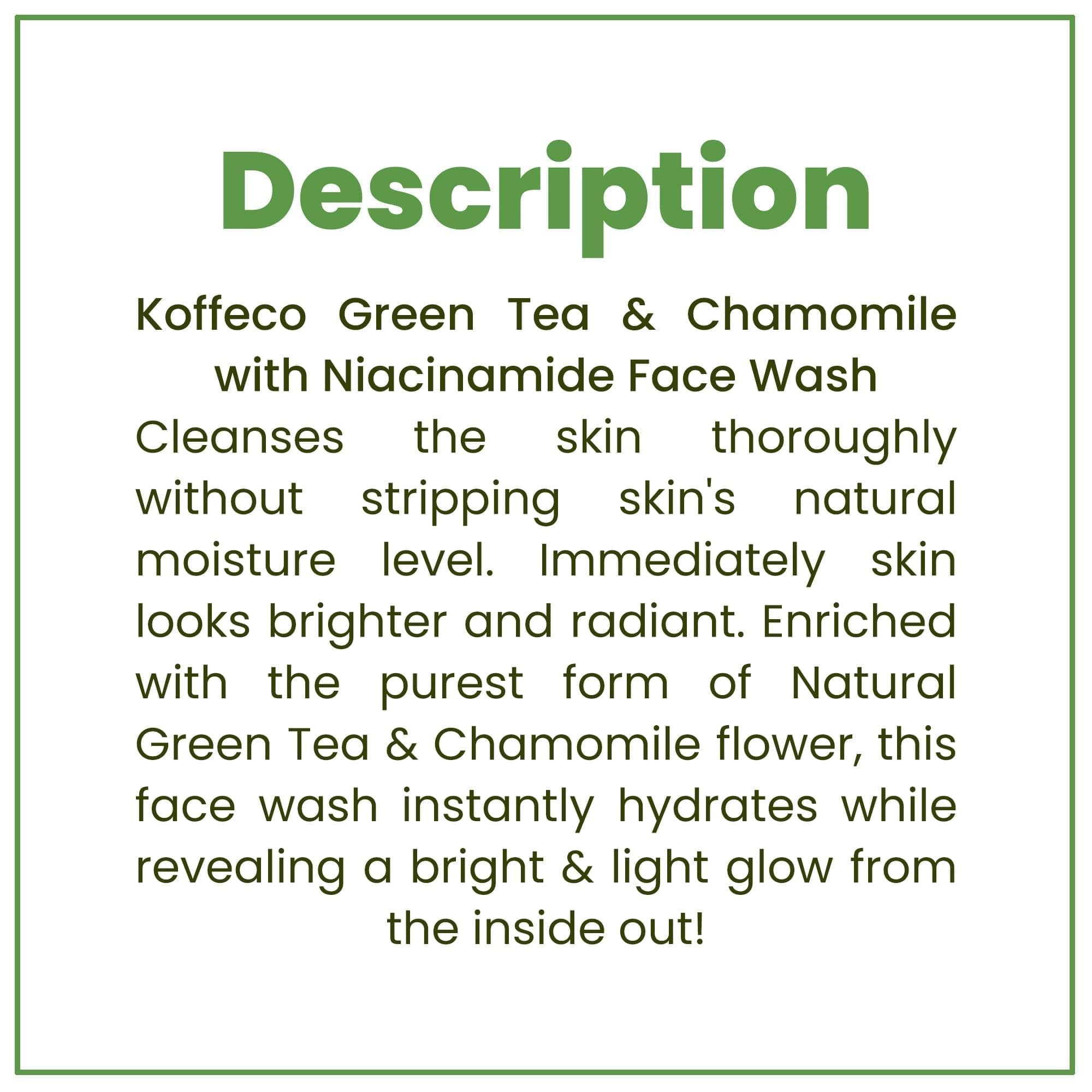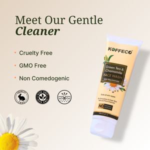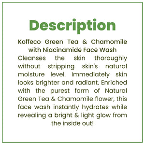 Koffeco Green Tea & Chamomile Face Wash Cleanses the skin thoroughly without stripping skin's natural moisture level. Enriched with the purest form of Natural Green Tea & Chamomile flower, this face wash instantly hydrates while revealing a bright & light glow from the inside out!