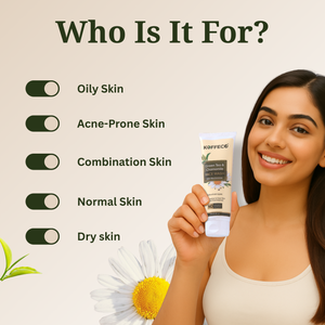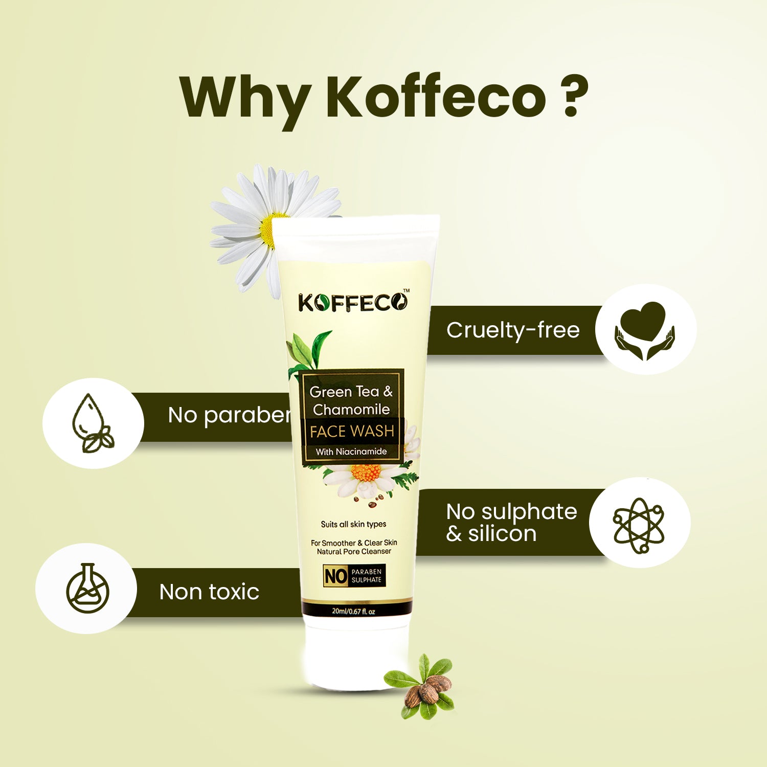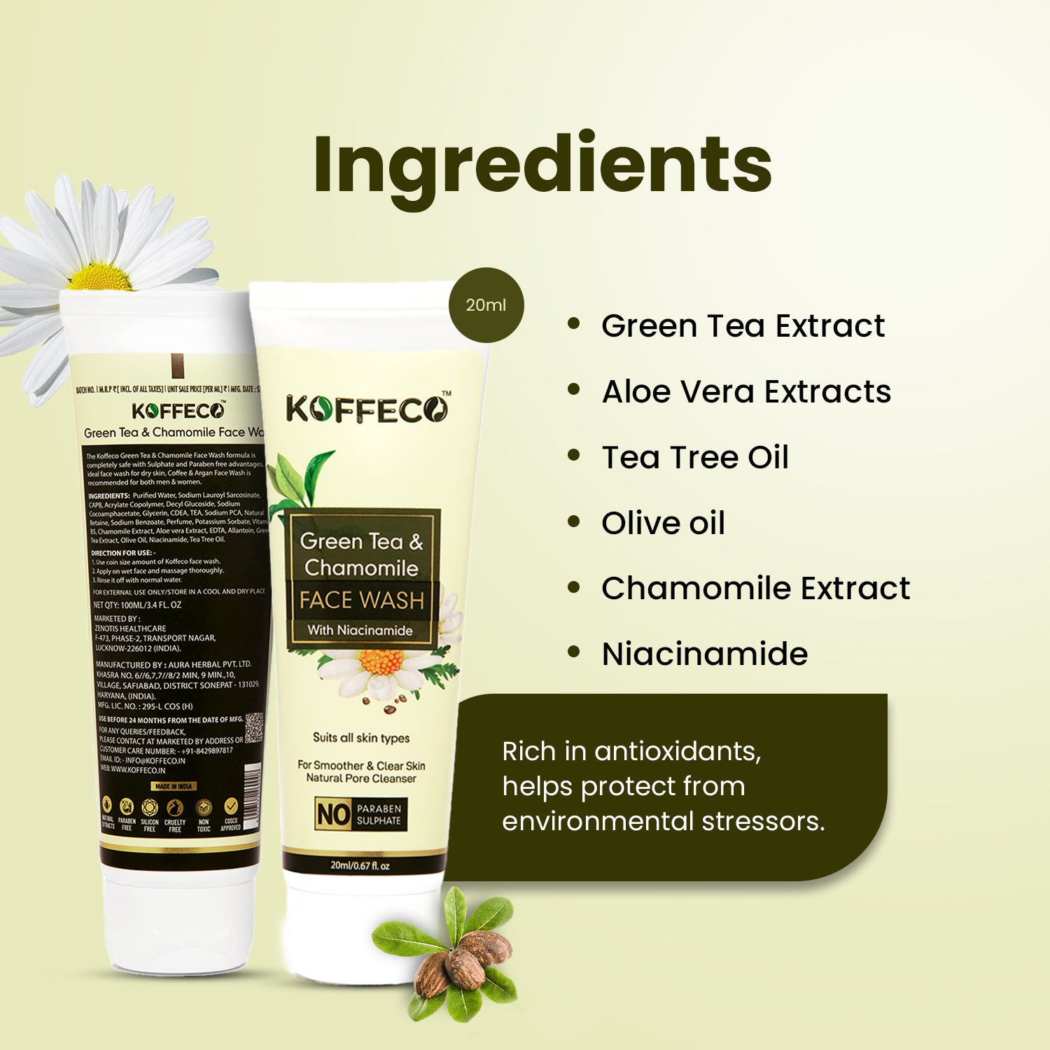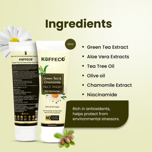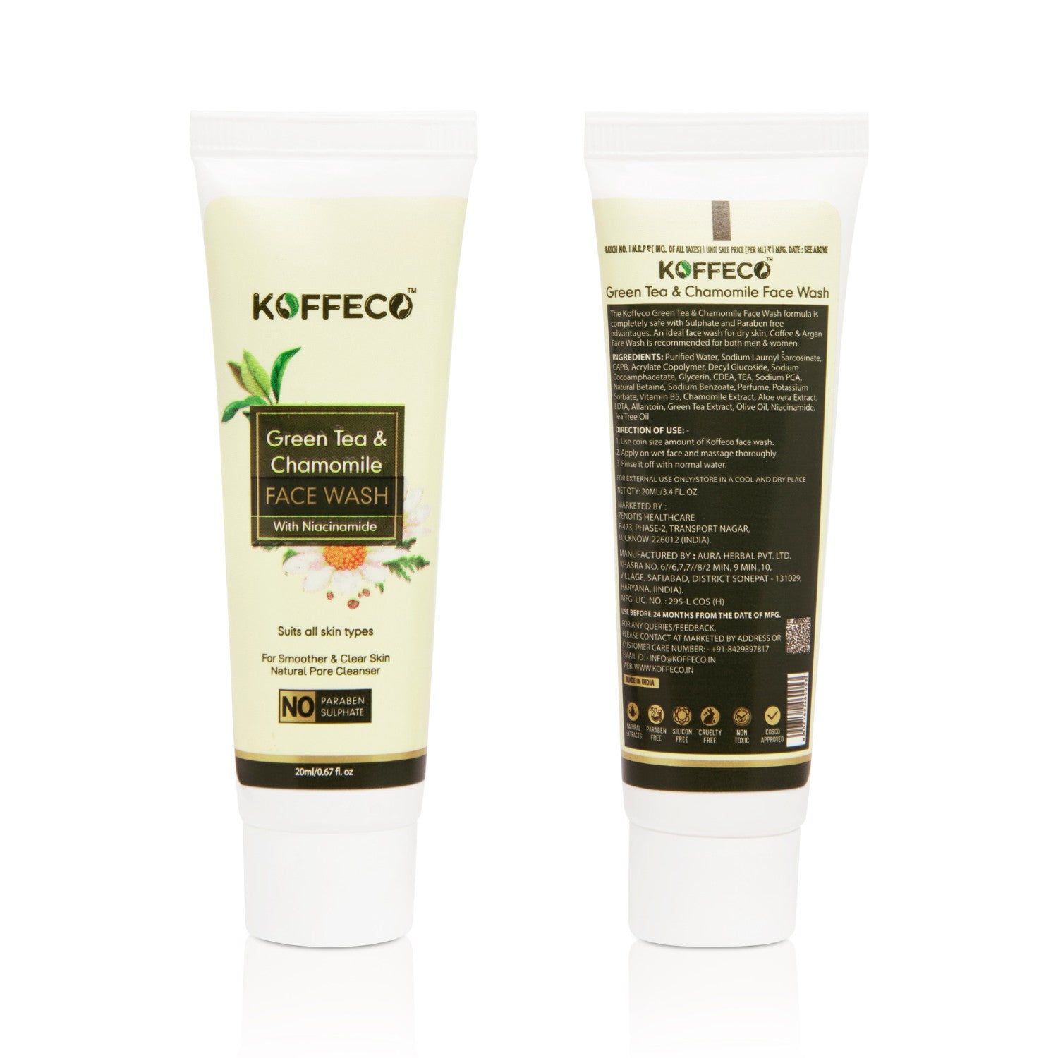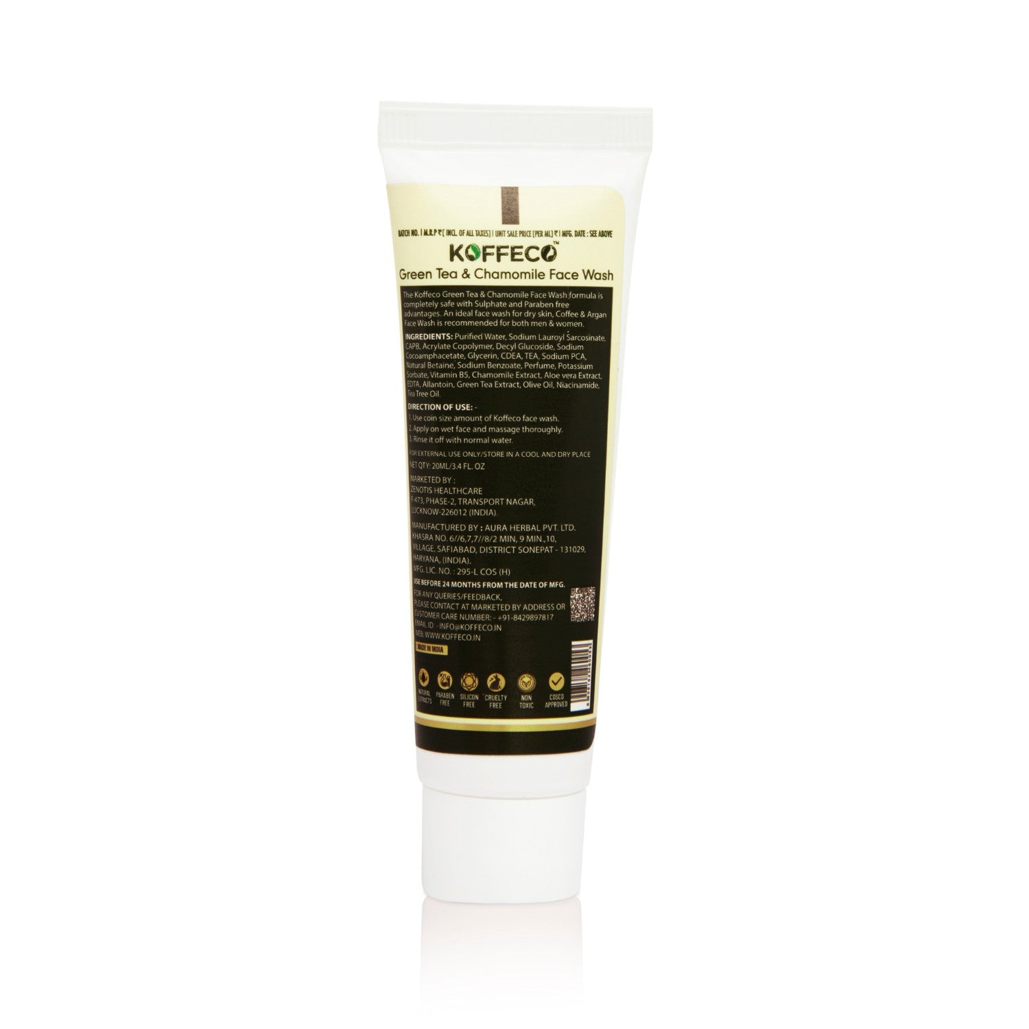 Koffeco Green Tea & Chamomile Face Wash Cleanses the skin thoroughly without stripping skin's natural moisture level. Enriched with the purest form of Natural Green Tea & Chamomile flower, this face wash instantly hydrates while revealing a bright & light glow from the inside out!